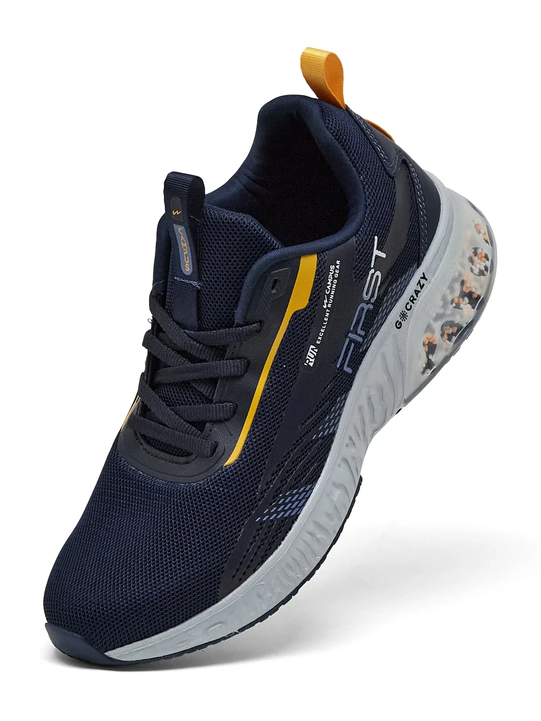 Take on everything from a casual hangout to a dedicated workout with the Campus First Men's Running Shoes. Designed to keep you comfortable, the innovative Ball Technology in the heel makes every step feel ultra-cushioned and packed with superior comfort. The PU foam insole and breathable mesh upper ensure long-lasting ease, while the secure lace-up closure provides a snug fit, reducing the risk of slips. Finished in a sleek navy and mustard colorway, these shoes complement any casual outfit, keeping you stylish and ready for action.