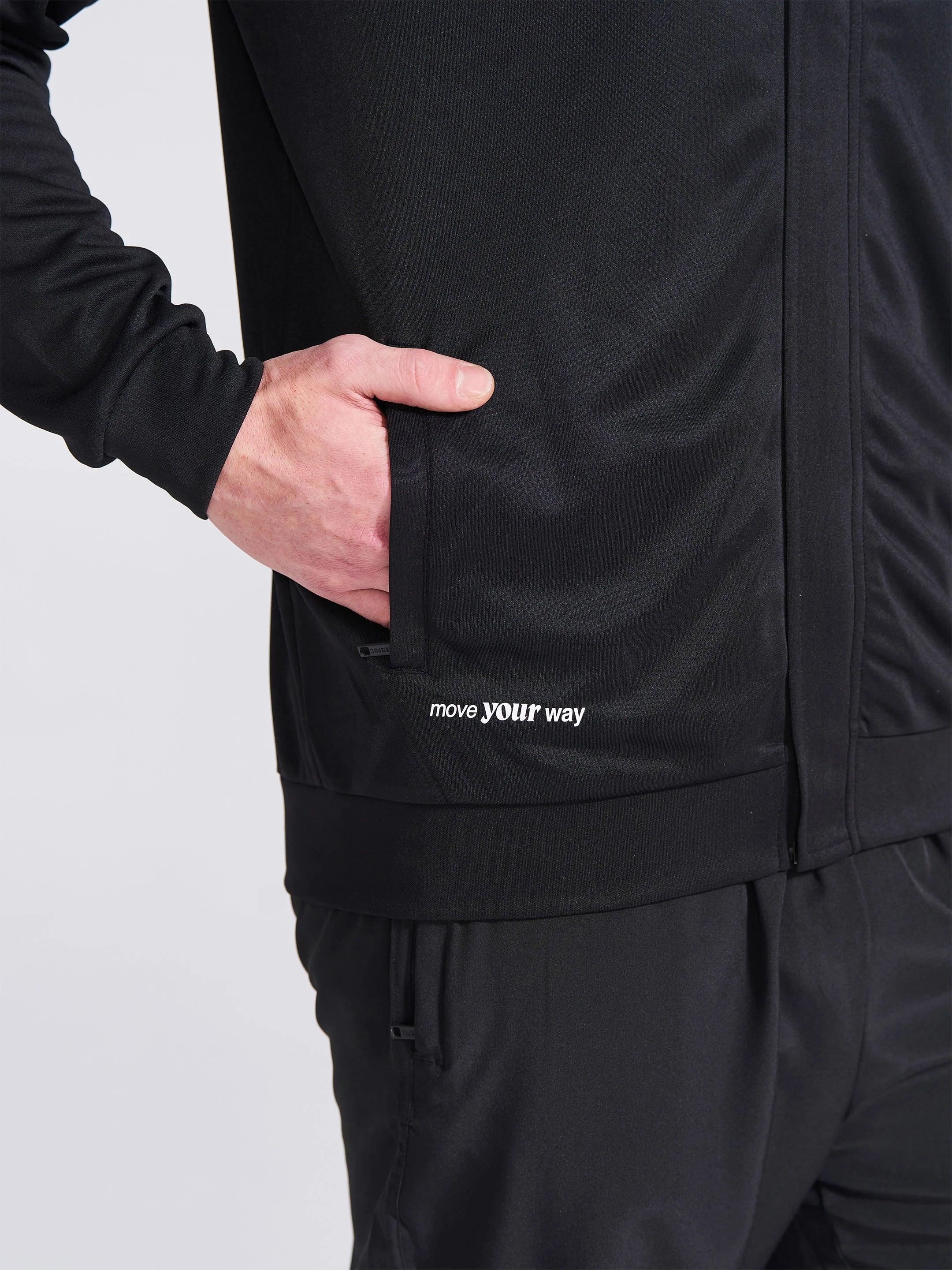 Zip up and get ready for anything. The Campus Full Zip Dry Fit Track Jacket in black has that rough-n-tough build with a lightweight, breathable feel that never holds you back. Made with polyester and built with 2-way stretch, it’s perfect for warmups, runs, and everything in between. The quick-dry fabric handles sweat smoothly, while anti-microbial and anti-odor properties keep things feeling fresh through long days. The anti-static finish keeps cling away, and the flap over the zipper gives the front a clean, streamlined look. The classic black shade nails that timeless, athletic vibe — crisp, sharp, and always on point. Complete the look with the Campus Full Zip Dry Fit Track Pants for a clean, coordinated track set.